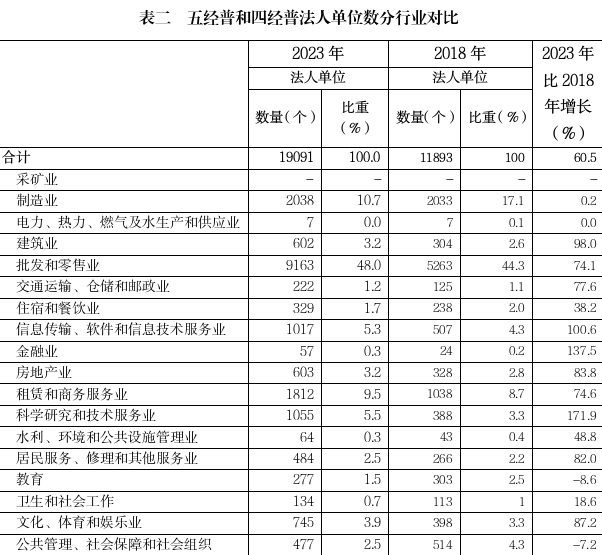 從行業(yè)增速看,新興生產(chǎn)性服務業(yè)成長快。除教育,公共管理、社會保障和社會組織法人單位有所減少外,其余行業(yè)法人單位均有不同程度的增長。2023年末,科學研究和技術服務業(yè)法人單位1055個,比2018年末增長171.9%;信息傳輸、軟件和信息技術服務業(yè)法人單位1017個,比2018年末增長100.6%。從行業(yè)占比看,制造業(yè)下降顯著。法人單位占比居前三的行業(yè)依次是批發(fā)和零售業(yè)、制造業(yè)、租賃和商務服務業(yè),分別占全部法人單位48.0%、10.7%、9.5%。但制造業(yè)占全部法人單位比重由2018年的17.1%下降到10.7%,回落6.4個百分點,下降明顯。